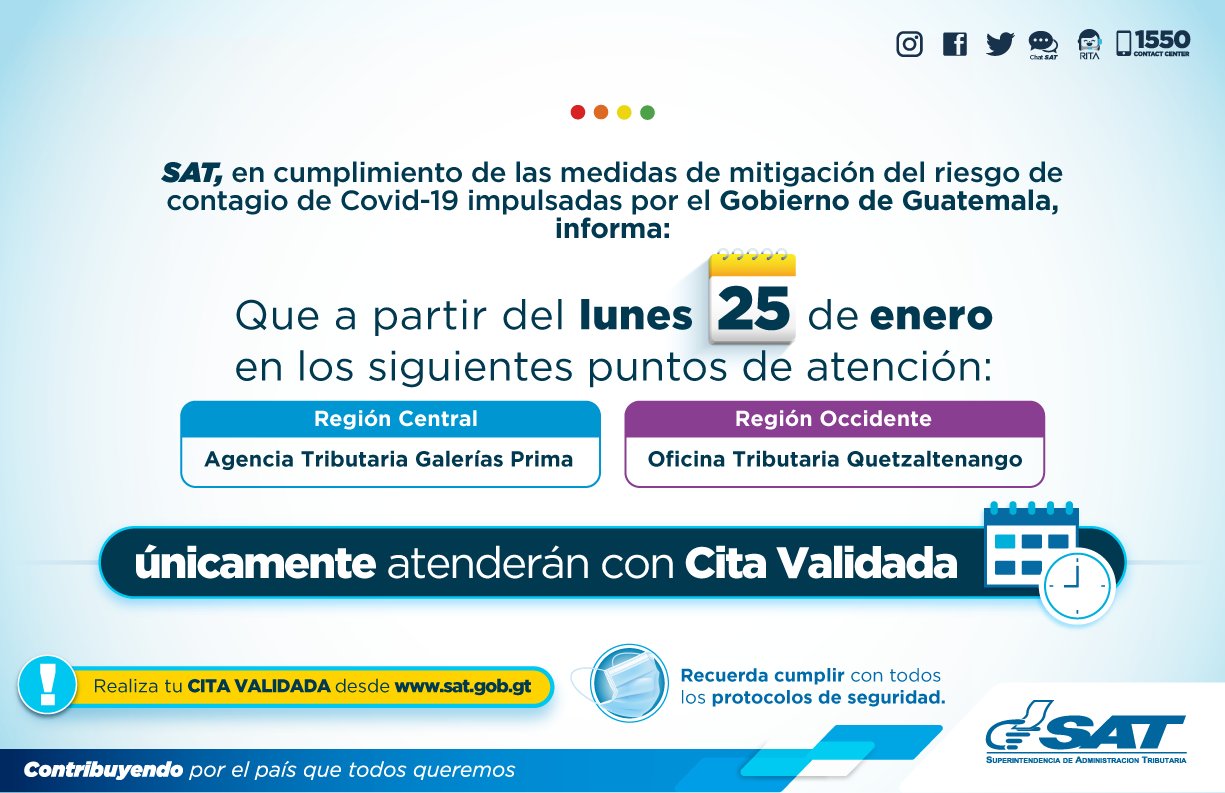 Sat Guatemala On Twitter Recuerda Que La Agencia Tributaria Galerias Primma Y La Oficina Tributaria De Quetzaltenango Estan Atendiendo Exclusivamente Con Cita Validada Genera La Tuya Desde Https T Co Gcppjbzbso Https T Co Gvzgehxkkt
